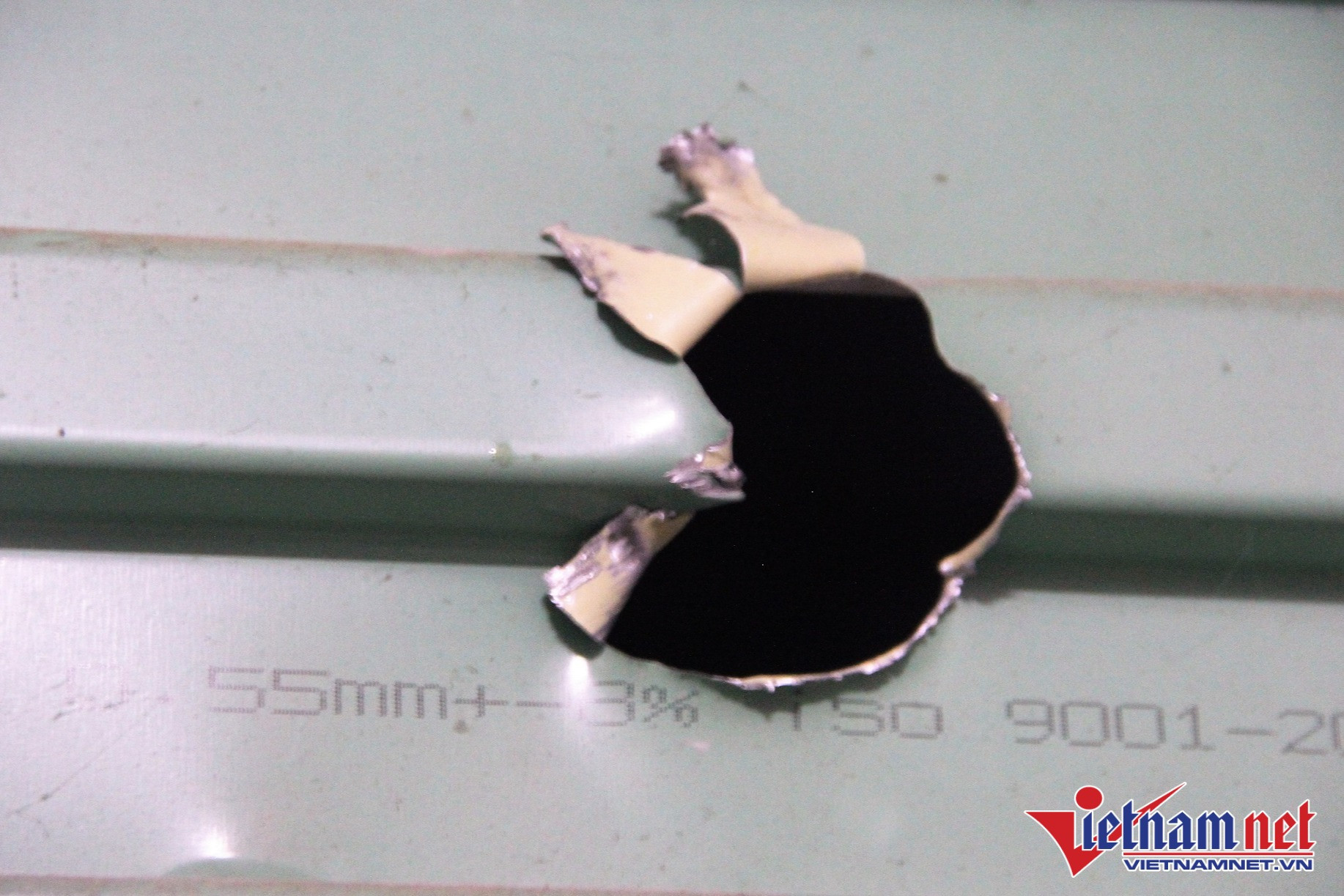“Mặc dù lúc xảy ra vụ nổ, nhà tôi cửa đóng then cài nhưng cũng bị hư hỏng nhiều thứ. Sức ép của vụ nổ làm mảnh vỡ xuyên thủng bờ tường, cửa tôn bị rách nhiều vết nhỏ. Đặc biệt, cửa kính bền chắc như vậy nhưng bị nứt rạn cả một cánh, xuyên thủng một lỗ”, anh Thái cho biết.