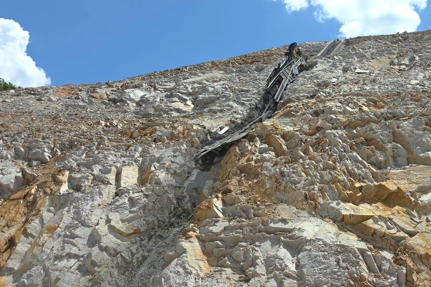Công nhân thi công bậc nước dựng đứng trên vách đá. Cốp pha được dựng bằng thủ công bị đổ sập. Ảnh: MNHiện trường sau khi vụ việc xảy ra. Ảnh: MNXe cấp cứu đưa nạn nhân đến bệnh viện cấp cứu. Ảnh: MN