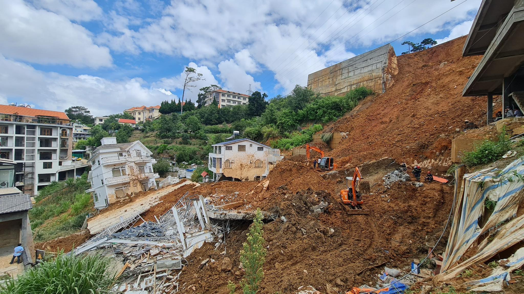 Trước đó, rạng sáng cùng ngày, bờ taluy của công trình đang xây trong hẻm đường Hoàng Hoa Thám, cao chừng 30m, bất ngờ đổ sập, kéo theo nhiều khối đất đá ập xuống 3 căn nhà dưới thung lũng. 7 người đang ngủ bị đất đá vùi lấp.