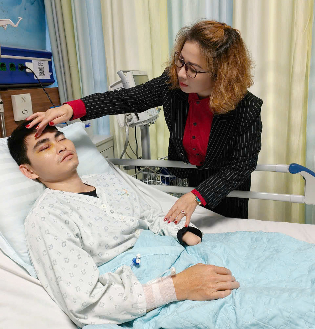 Kể về quá trình điều trị của chồng, chị L. không giấu nổi sự xót xa. Những ngày đầu nhập viện, cơn đau từ các vết bầm tím trên mặt và vùng ngực khiến anh Hưng không thể chợp mắt.
