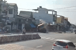 Sau cú tông vào xe máy của ông V, xe tải tiếp tục va chạm với 2 xe máy khác, tông sập phần trước của 4 căn nhà ven đường rồi lật ngang giữa lề.