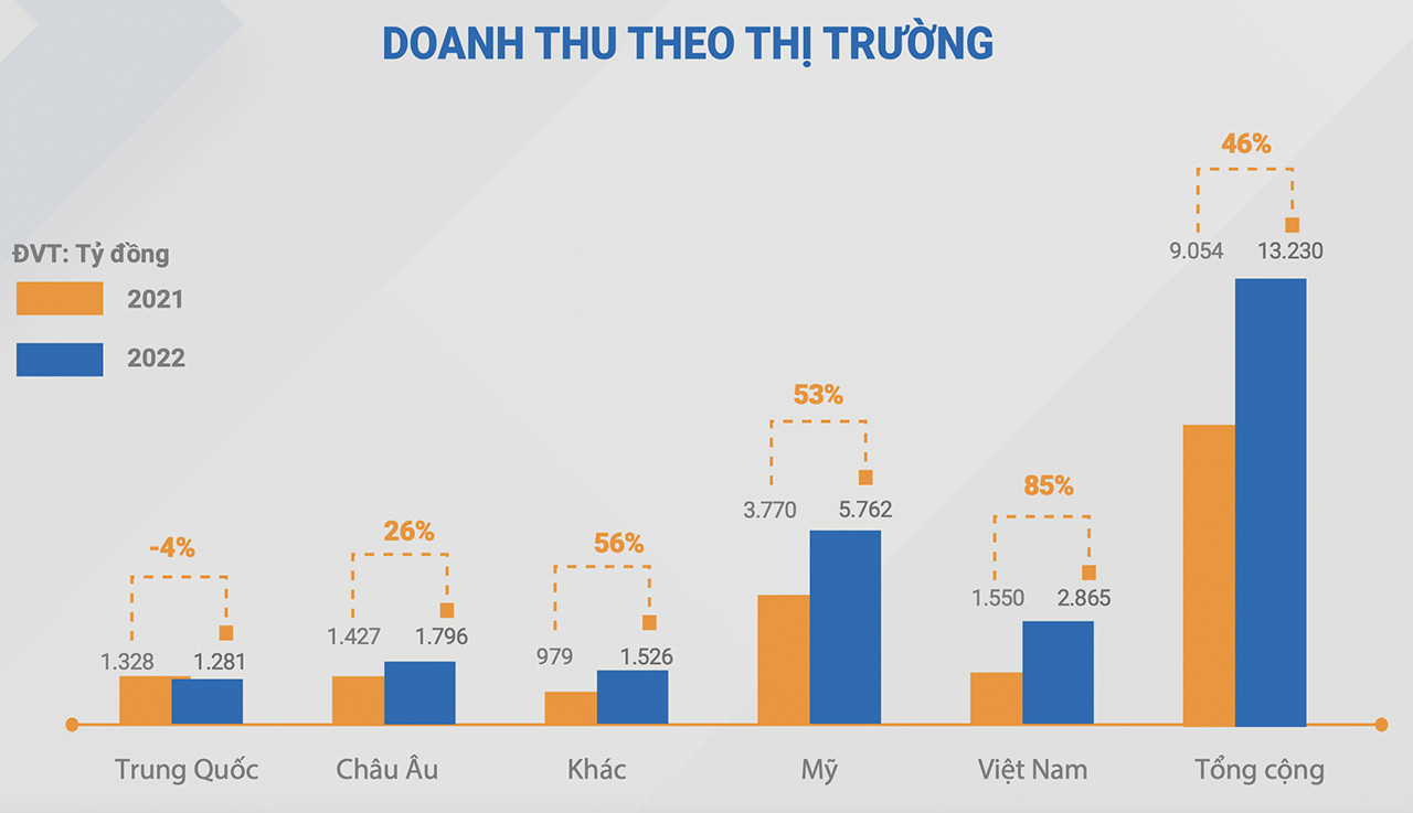 Năm 2021, Trung Quốc chiếm tới 22% tổng doanh thu của ANV. Tuy nhiên, đến năm 2022, do ảnh hưởng bởi chính sách Zero Covid tại quốc gia này, doanh thu đến từ Trung Quốc đã sụt giảm 27% so với năm 2021 và chỉ chiếm 11% tổng doanh thu.