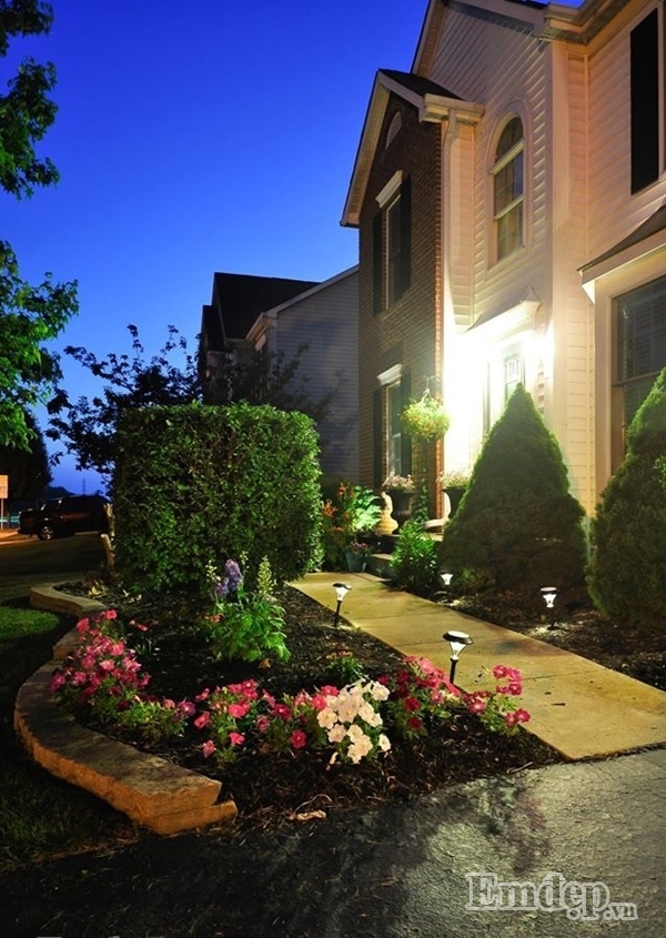 Lối vào nhà với những bụi hoa nở rực rỡ, nổi bật trên màu xanh của cây cỏ |