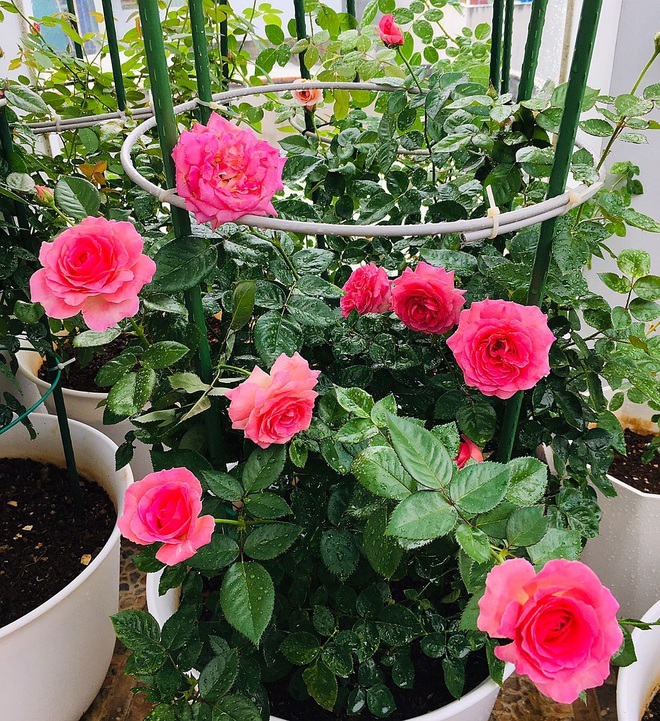 Hiểu rõ đặc tính từng cây, thêm chút "mát tay" nên chị Hằng trồng hồng không quá khó khăn. Các cây đều sống khỏe, nở hoa đẹp và to. Chị thường hái hoa tươi vào cắm, trang trí không gian sống cũng như tự chế nước cất hoa hồng, làm trà hoa hay món ăn,...