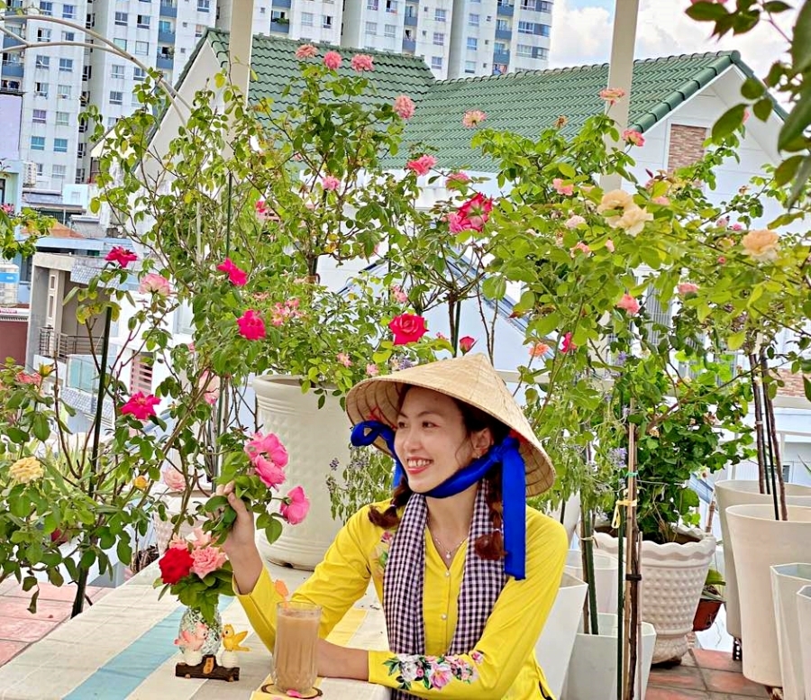 Cuối tuần, chị Châu Hữu Chí (SN 1980, quận Gò Vấp, TP.HCM) lên sân thượng, vùi mình trong vườn hoa hồng rực rỡ sắc màu. Dưới tán cây, chị bón phân, tỉa lá, cắt những đóa hồng sực nức hương thơm để cắm trong nhà.