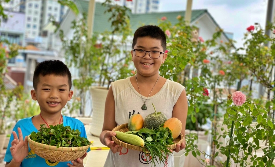 | Các bé tỏ ra rất thích thú khi được cùng mẹ chăm sóc, thu hái cây trái trong khu vườn nhỏ vào mỗi cuối tuần. |