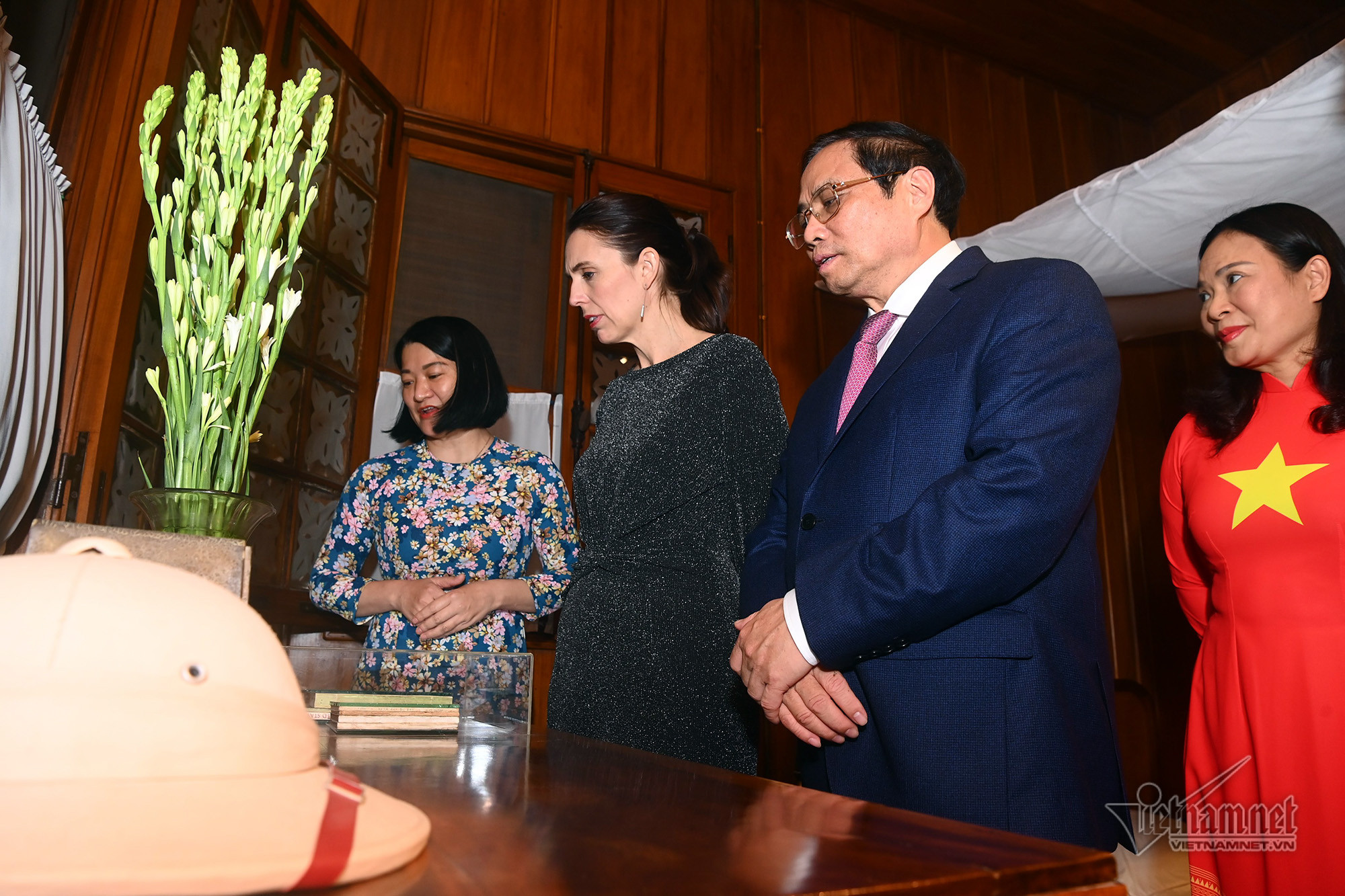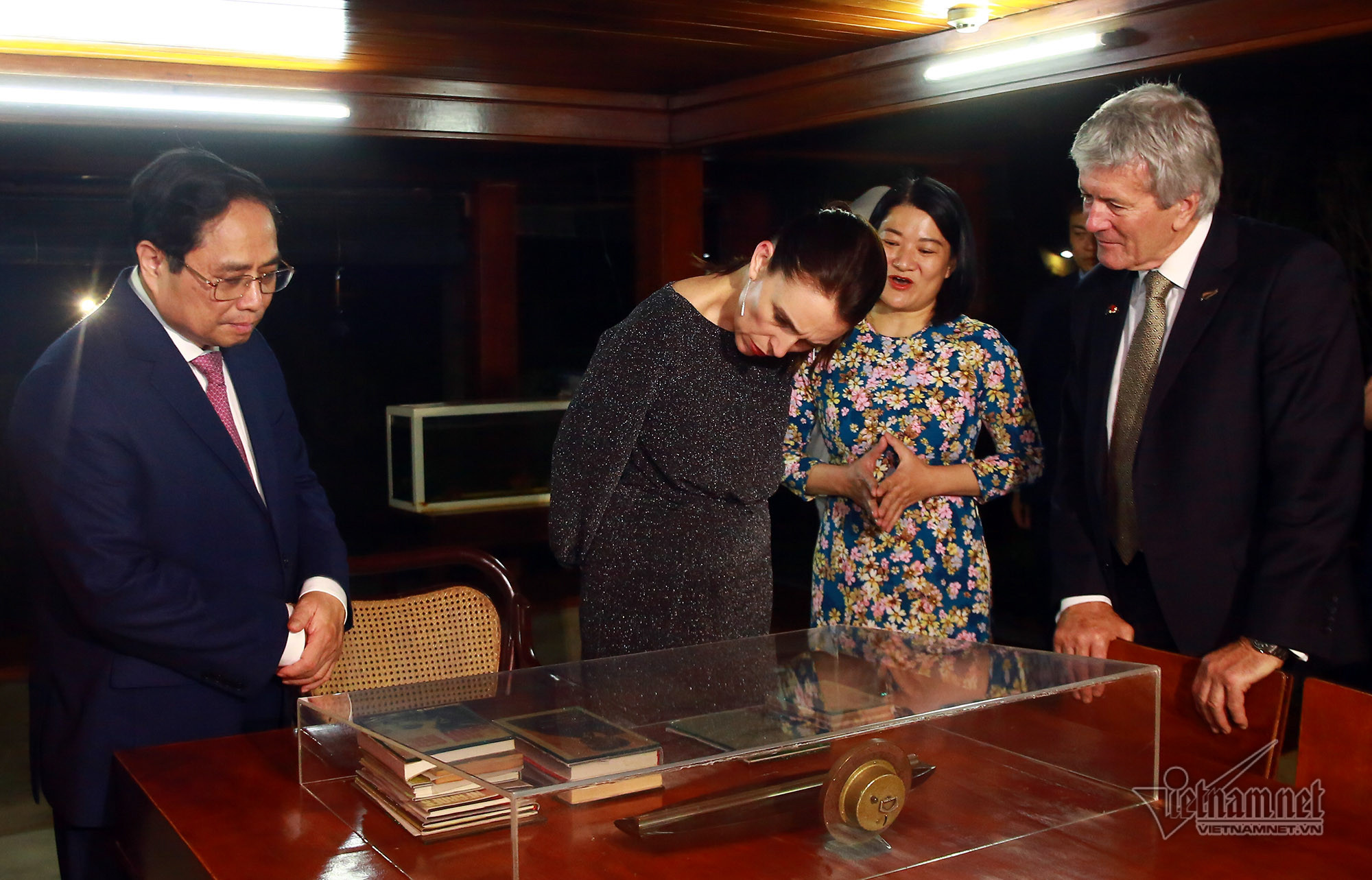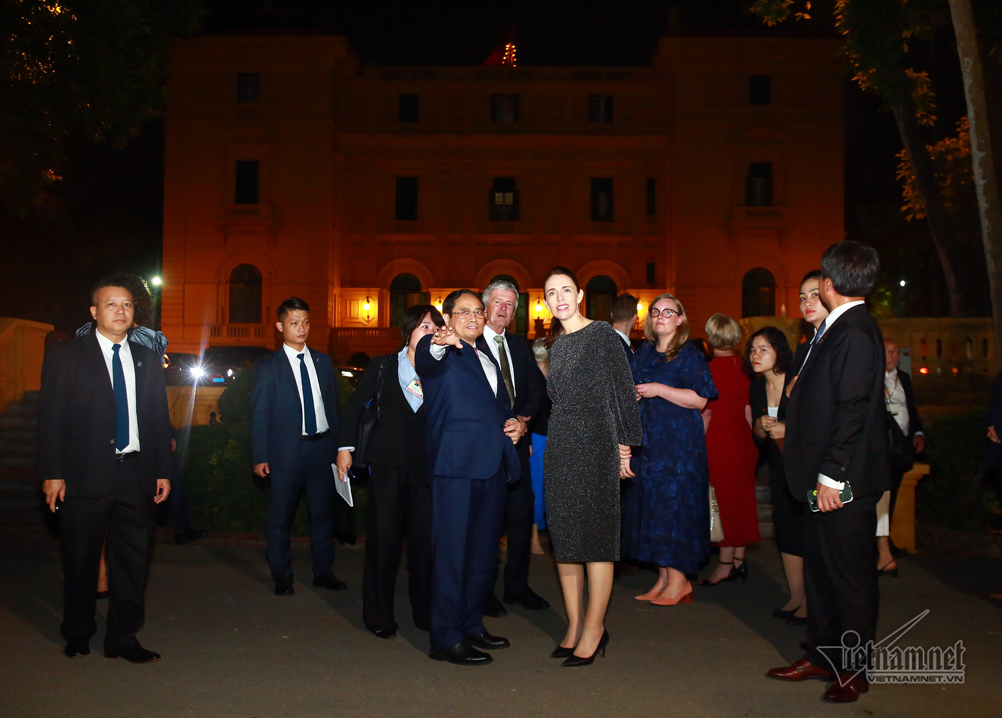Tối ngày 14/11, sau tiệc chiêu đãi chính thức, Thủ tướng New Zealand Jacinda Ardern và Thủ tướng Phạm Minh Chính đã cùng dạo bộ, thăm nhà sàn Bác Hồ trong Khu Di tích Phủ Chủ tịch.