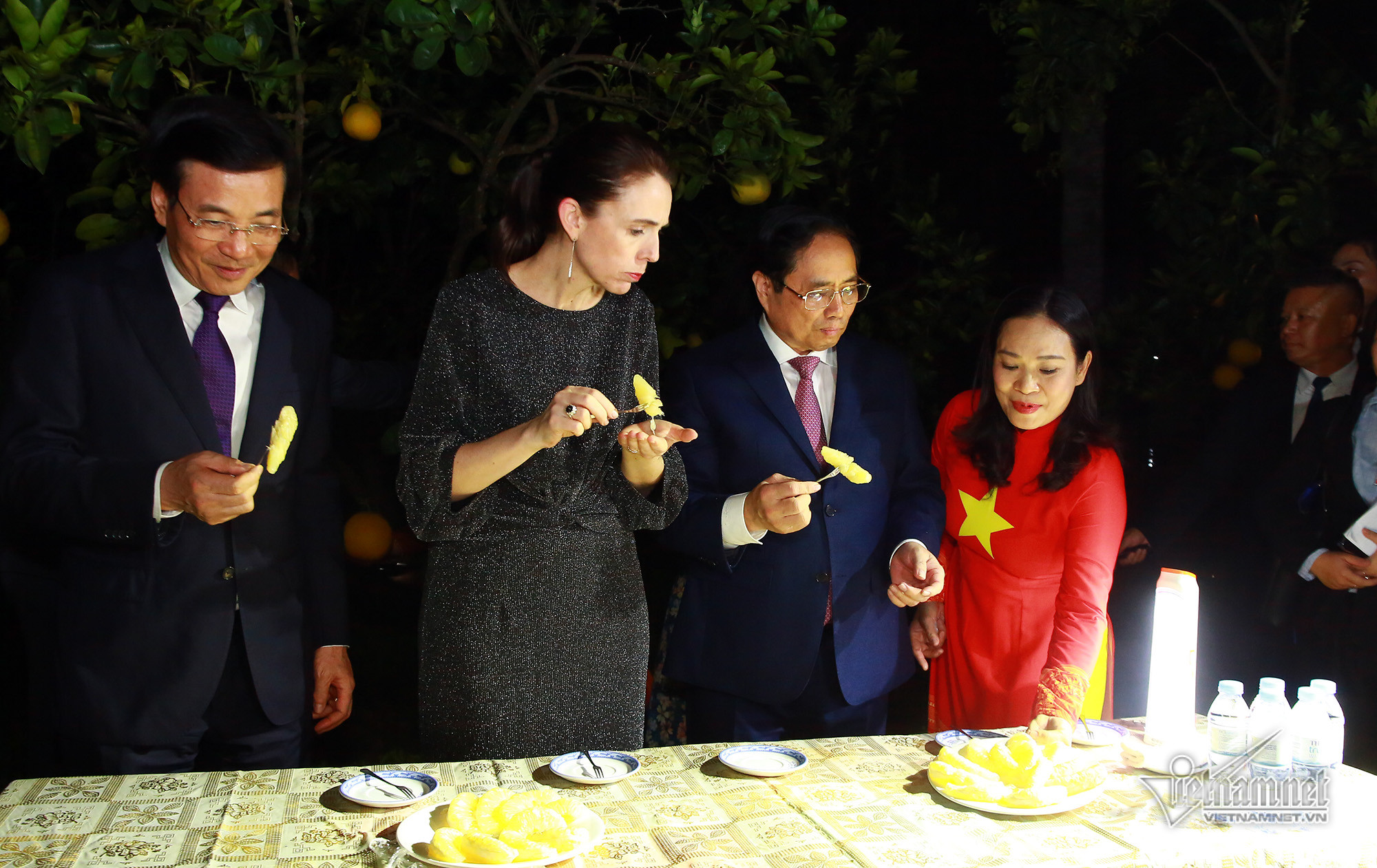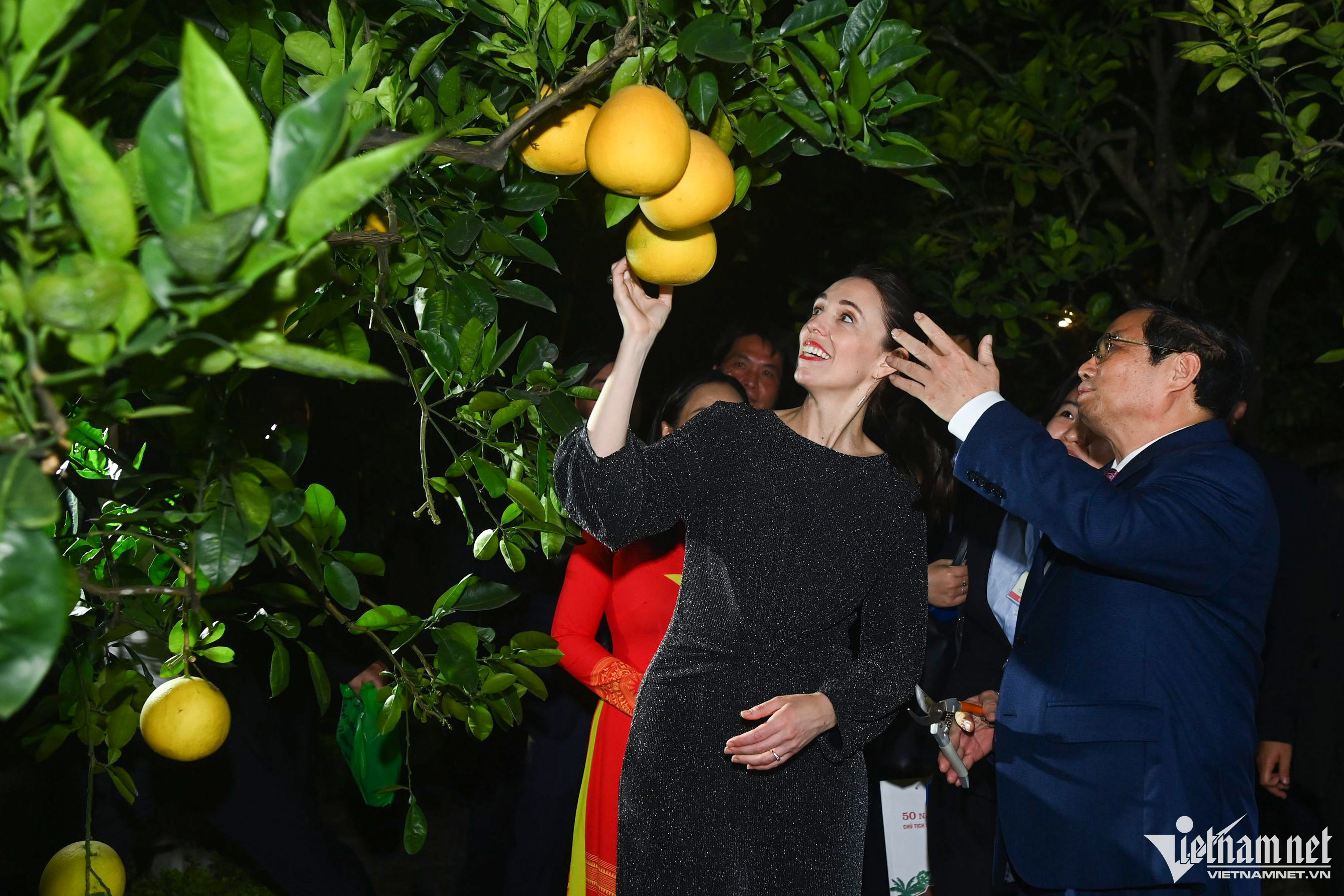 Thủ tướng Phạm Minh Chính cùng Thủ tướng New Zealand thăm nhà sàn Bác Hồ. Bà Jacinda Ardern bày tỏ xúc động khi xem những kỷ vật tại đây.Nữ Thủ tướng ghi sổ cảm tưởng trong khu di tích.Thủ tướng New Zealand nghe giới thiệu về cuộc đời, sự nghiệp của Chủ tịch Hồ Chí MinhHai Thủ tướng đã ra khu vườn cạnh nhà sàn để xem những trái bưởi đang vào độ đúng mùa.Hai Thủ tướng cùng cắt bưởi... ... và thưởng thức ngay tại vườn.Thủ tướng Phạm Minh Chính tặng quà lưu niệm của khu di tích Chủ tịch Hồ Chí Minh cho Thủ tướng New ZealandChiều nay, Thủ tướng Phạm Minh Chính và Thủ tướng New Zealand cũng đã gặp đội tuyển bóng đá nữ quốc gia Việt Nam nhân dịp tham dự Giải vô địch Bóng đá nữ thế giới năm 2023 tại New Zealand và Australia.