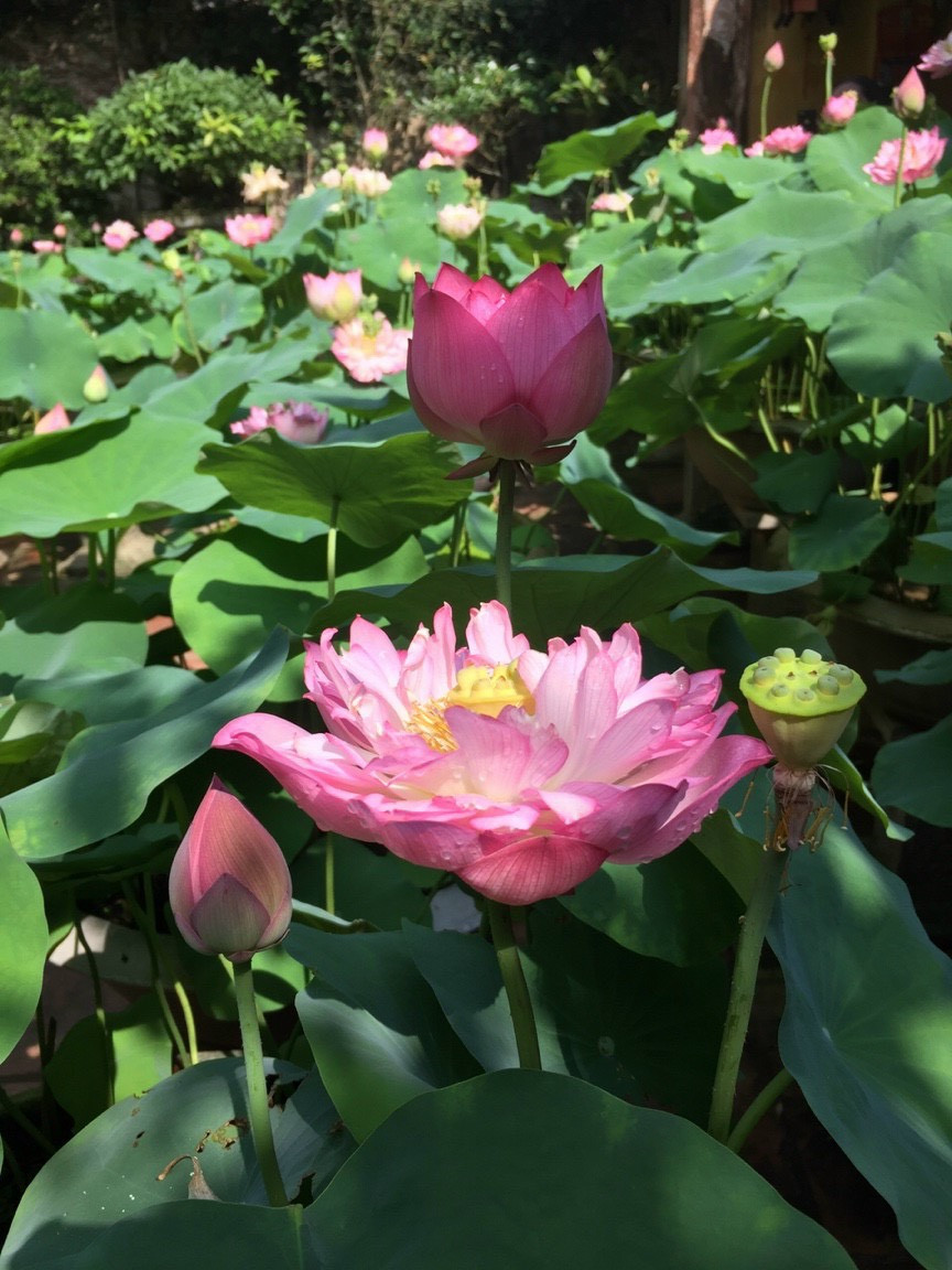 Từ một nhánh sen cung đình xin được, ông đã nhân giống trồng trong chậu thành công. Và từ đó, ông Điệp đã biến khoảng sân rộng hàng chục mét vuông trước ngôi nhà cổ thành một vườn sen di động.