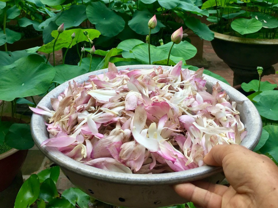 Mỗi ngày, vợ chồng ông Điệp thưởng thức trà sen giữa vườn ngát hương. Cùng nhau thu hái lá sen tươi phơi trong bóng râm làm trà lá sen, thu cánh hoa phơi khô làm ruột gối.