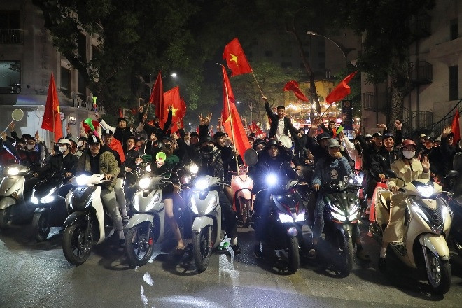 Sau chiến thắng của đội tuyển Việt Nam tại trận chung kết lượt đi ASEAN Cup 2024, dòng người đổ ra nhiều tuyến đường ở Hà Nội để ăn mừng. Tuy nhiên, tại nhiều ngã tư, người dân nghiêm ngắn chấp hành dừng chờ đèn đỏ.