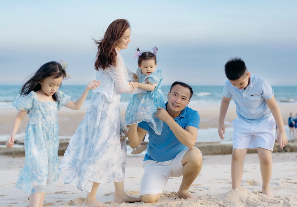Cả gia đình diện đồ tông xuyệt tông màu xanh dạo chơi trên bãi biển. Ba con của nữ ca sĩ gồm bé Voi 8 tuổi, bé Xu 6 tuổi và bé út Mio gần 2 tuổi.