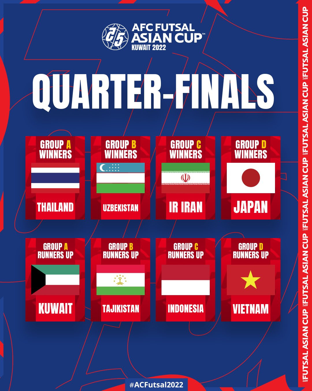 Trong khi đó, Nhật Bản - nhất bảng D chỉ phải gặp tuyển futsal Indonesia ở tứ kết sau khi giành ngôi nhất bảng từ tay ĐT Việt Nam.