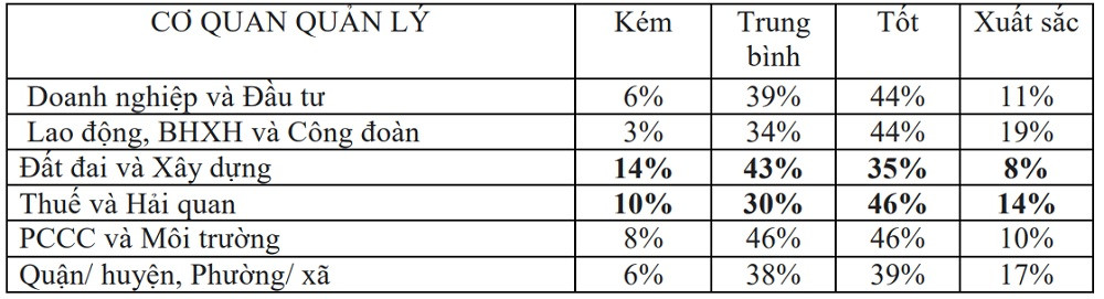Nhìn chung, có 55-63% các lĩnh vực đều đạt loại tốt và xuất sắc; riêng cơ quan quản lý đất đai và xây dựng chỉ đạt tỷ lệ 43%. Cụ thể, lĩnh vực đất đai và Xây dựng bị 14% doanh nghiệp đánh giá kém, 43% doanh nghiệp đánh giá trung bình; lĩnh vực thuế và hải quan có 10% doanh nghiệp đánh giá mức độ kém, 30% đánh giá mức độ trung bình.