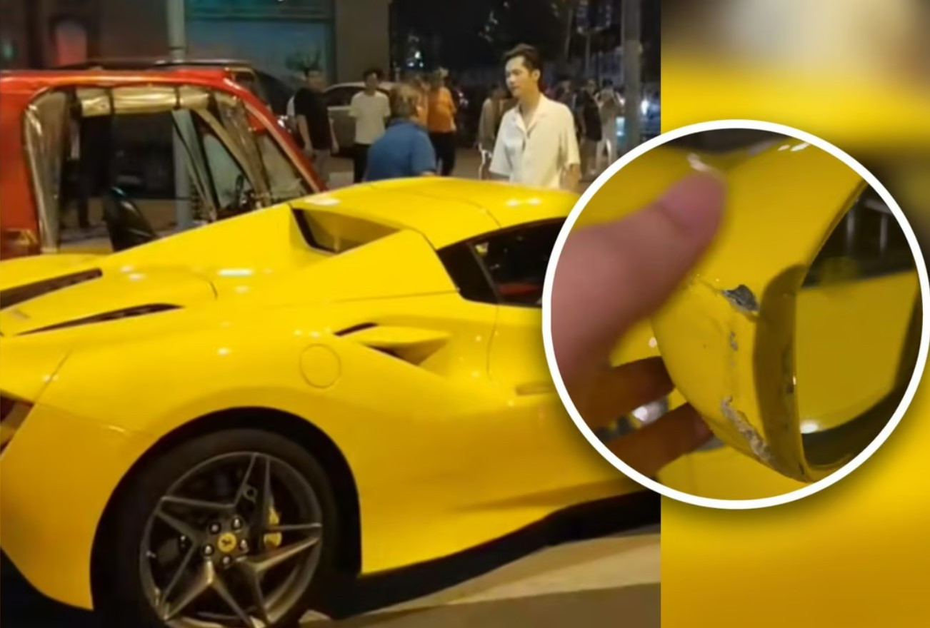 Theo đoạn video được lan truyền trên mạng xã hội, khi đang dừng tại một ngã tư, siêu xe Ferrari bất ngờ bị một chiếc xe ba bánh màu đỏ va chạm, khiến phần thân xe và gương chiếu hậu bị trầy xước đáng kể.