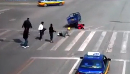 Chiếc xe 3 bánh lao với tốc độ cao lạng lách đâm vào một nhóm người đi bộ sang đường. Tài xế xe sau đó cũng trở thành nạn nhân.