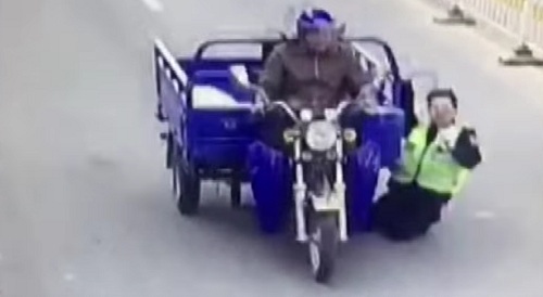 Hình ảnh được ghi lại từ camera an ninh cho thấy, chiếc xe 3 bánh đã kéo một cảnh sát trượt trên đường khoảng 70m trước khi hất ngã và chèn qua chân người này.
