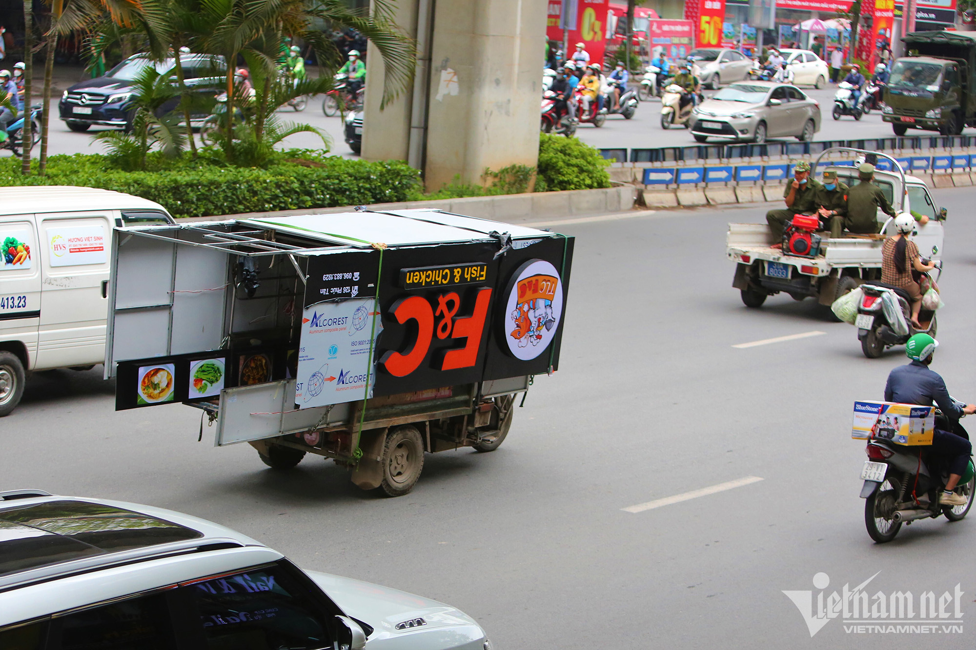 Các loại xe này chở từ những tấm biển quảng cáo dài vượt thân xe cả mét đến những bó giàn giáo sắc nhọn. Cá biệt, có xe chở hàng rào sắt được buộc kín ba bề, nặng hàng trăm cân.