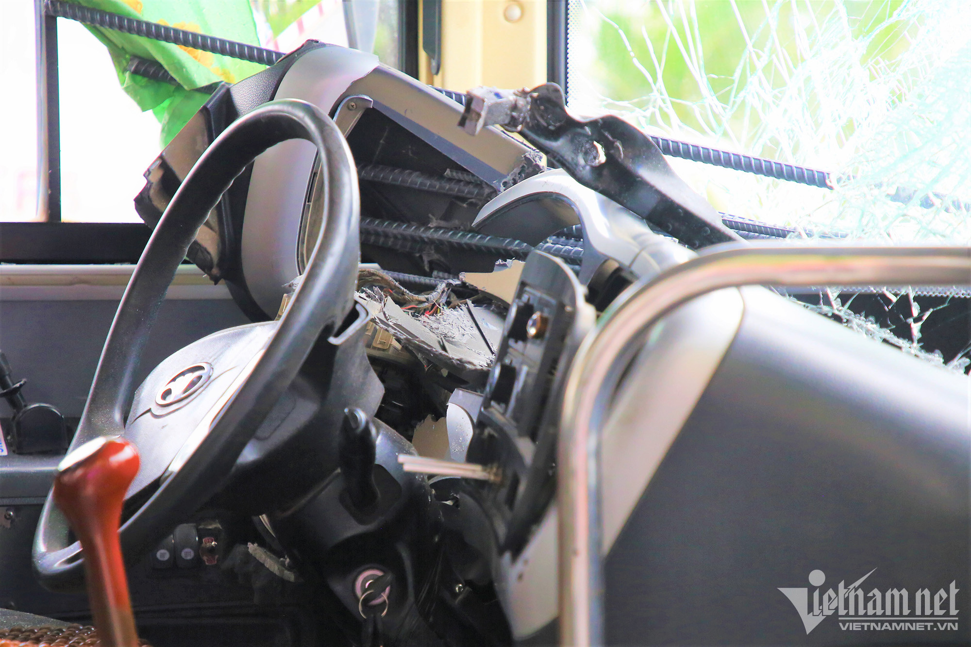 Sau cú va chạm, cả bó sắt đã đâm thủng kính ô tô xuyên vào buồng lái. Rất may vụ tai nạn không có thiệt hại về người.
