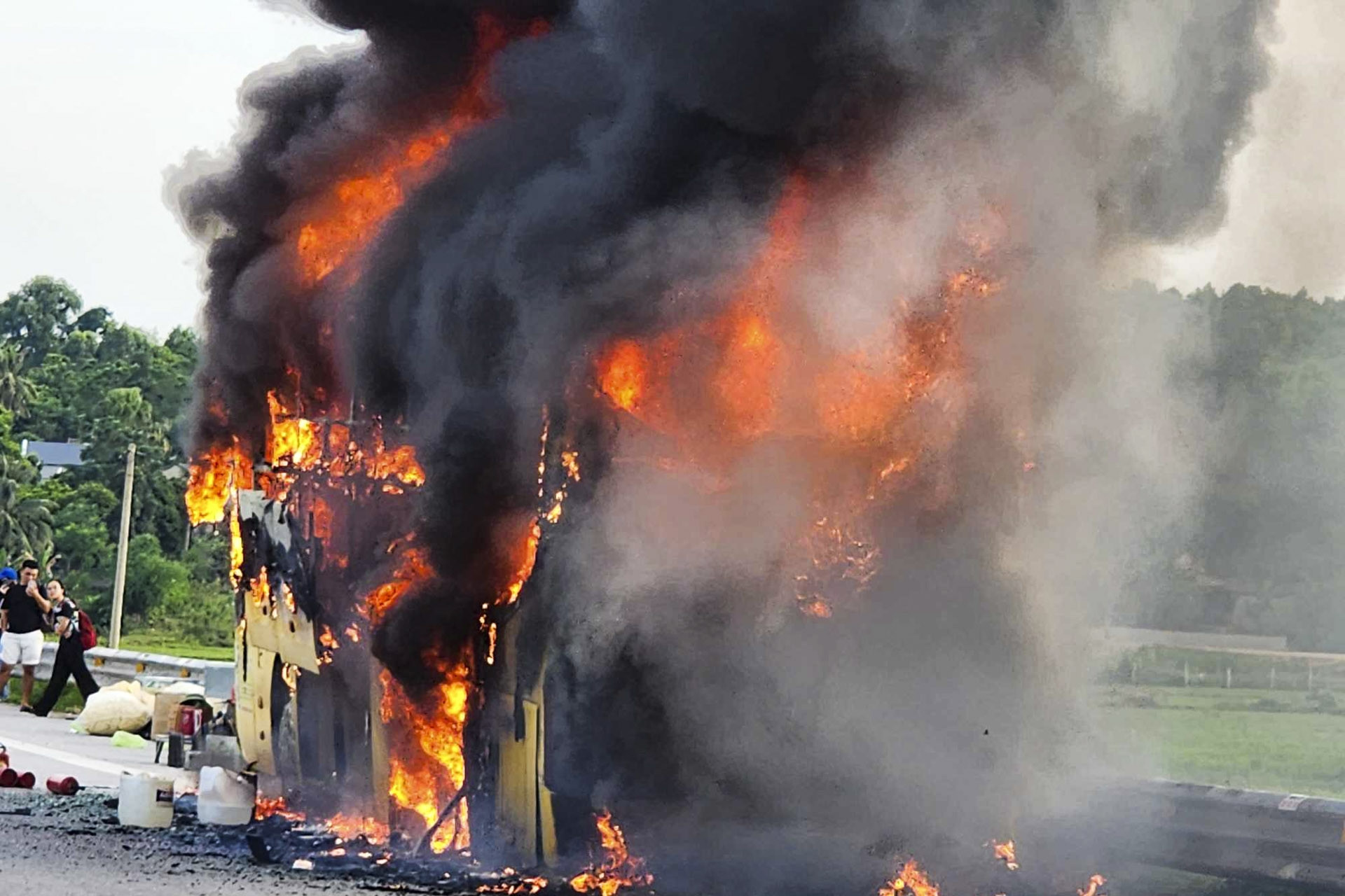 Tài xế Thuận liền dừng xe, thông báo cho mọi người biết và tìm cách dập lửa song mọi nỗ lực đều bất thành. Hàng chục người trên xe hoảng loạn la hét và thoát ra bên ngoài.