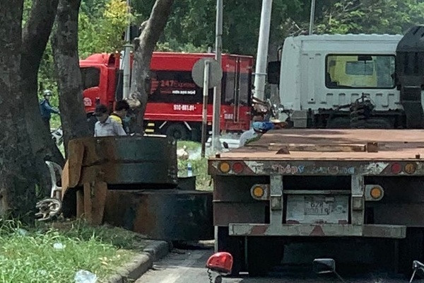 Đứng bán vé số trên vỉa hè đại lộ Nguyễn Văn Linh, người đàn ông bị cuộn sắt nặng cả tấn rơi xuống, tông trọng thương, xe máy bị hư hỏng nặng.