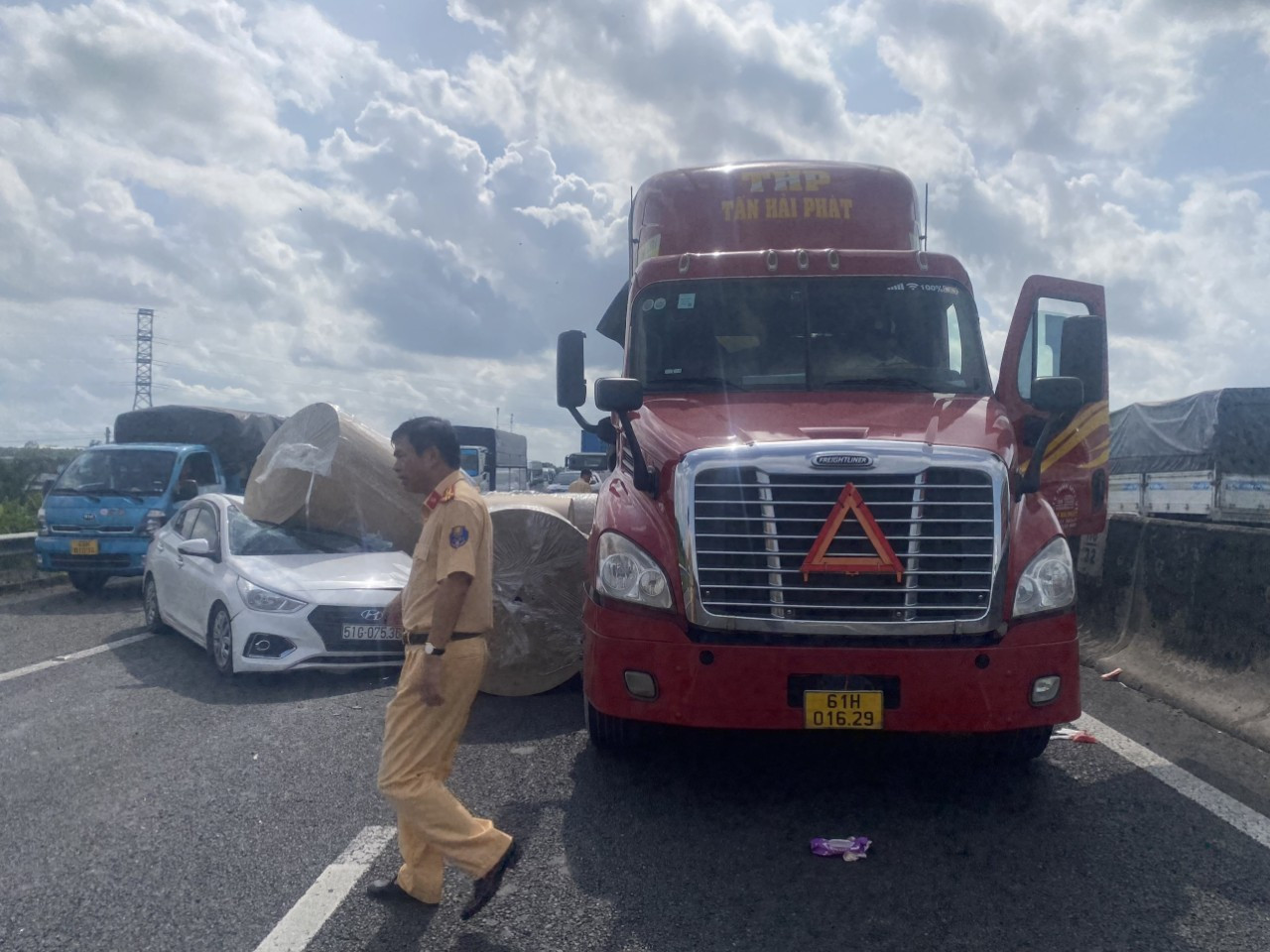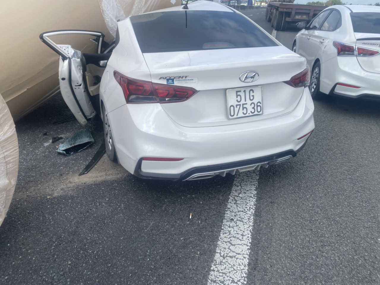 Khi xe chạy đến địa bàn TP Long An đã làm rớt nhiều cuộn giấy xuống đường cao tốc, trong đó một cuộn giấy đè trúng ô tô 5 chỗ chạy cùng chiều. Tại hiện trường, ô tô 5 chỗ bẹp dúm phần đầu, làm 3 người trên xe bị thương.
