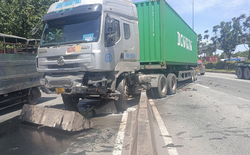 Sau khi tông vào đuôi ô tô hiệu Mazda, tài xế xe container đánh lái sang phải để tránh và tông vào dải phân cách bằng bê tông, rồi dừng lại trên làn đường hỗn hợp.