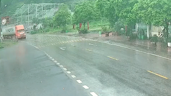 Chiếc xe container phanh gấp khi chạy tốc độ cao trên đoạn đường ướt mưa khiến phần đầu xe quay 180 độ so với thùng cotainer phía sau.