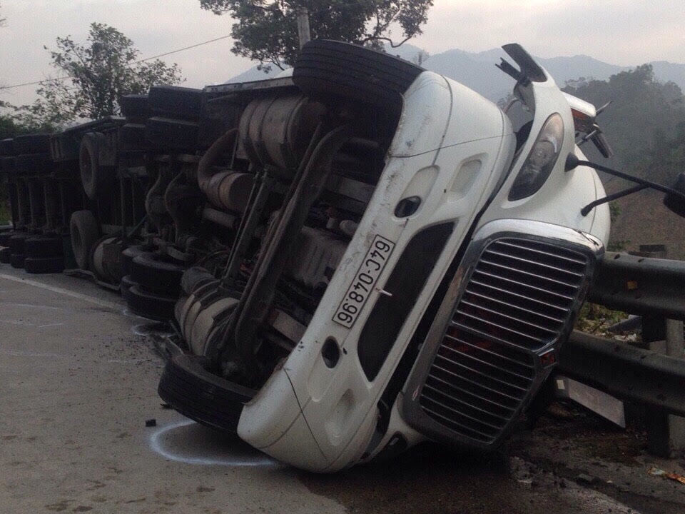 Dù được lực lượng CSGT tuần tra nhắc nhở đổ đèo cẩn thận nhưng tài xế vẫn chủ quan khiến xe bị lật, bẹp dúm làm tài và phụ xe gãy chân, tay.
