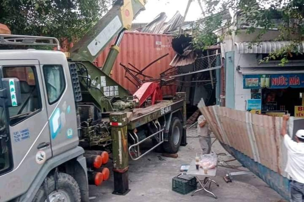 Xe container sau đó lao sang đường tông vào nhà dân ven tỉnh lộ 8.