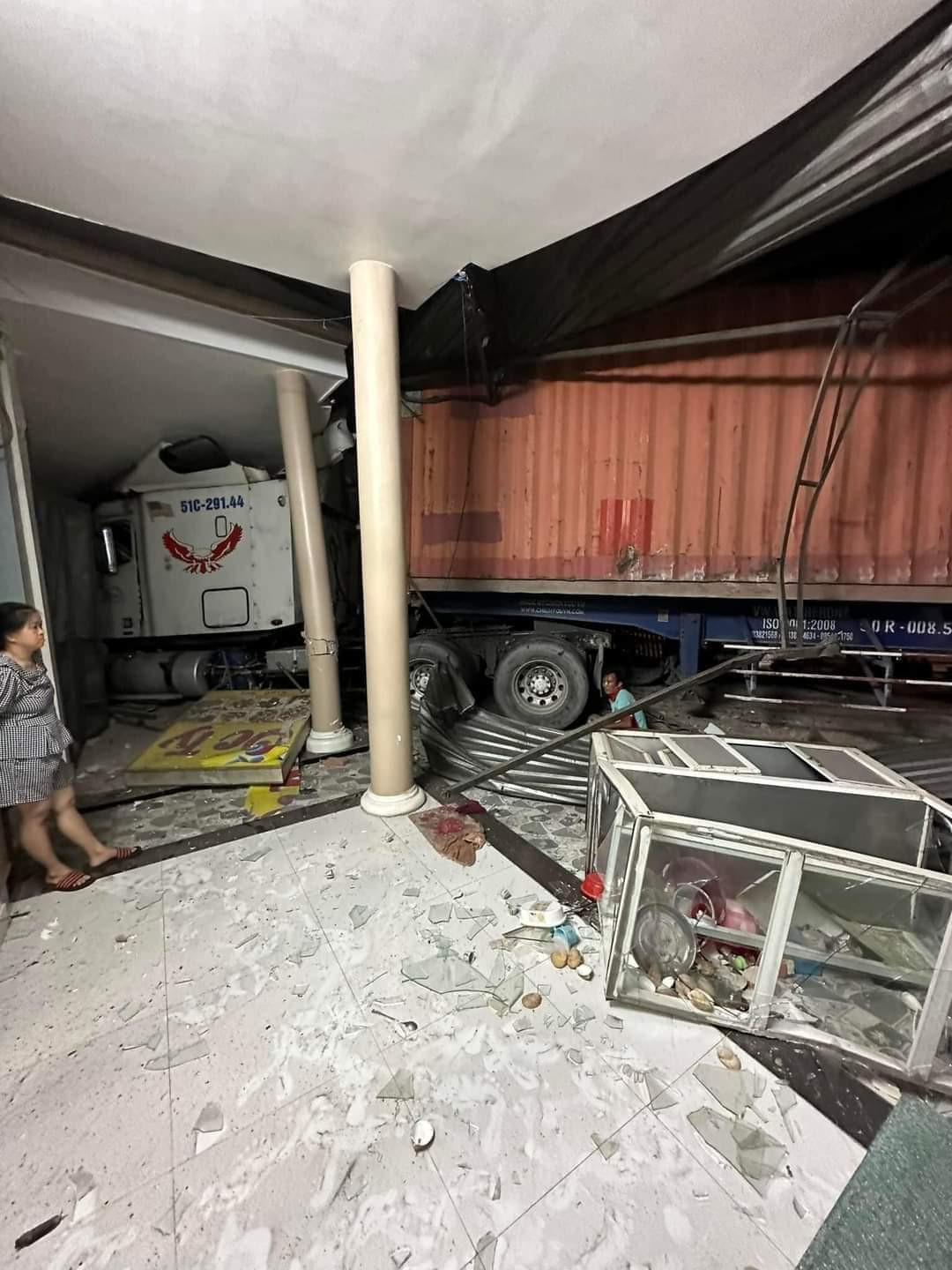 Tại hiện trường, xe container lọt thỏm giữa ba nhà dân, nhiều mảng tường, vật dụng bị húc văng tứ tung. Đầu xe container biến dạng.