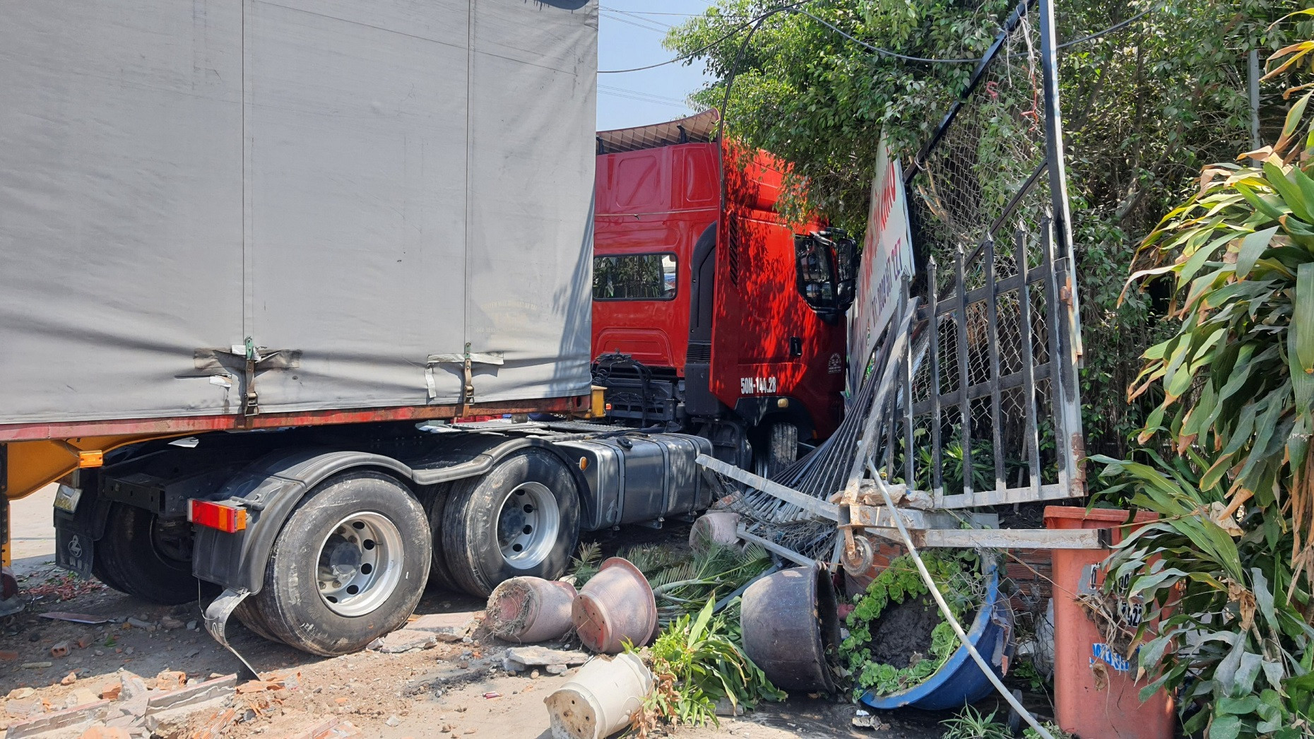 Xe này lấn sang phần đường ngược lại tông và cuốn xe máy do một người đàn ông cầm lái vào gầm. Xe container chỉ dừng lại khi tông ngã hàng loạt cây xanh và cổng rào bằng lưới thép của cửa hàng nông sản