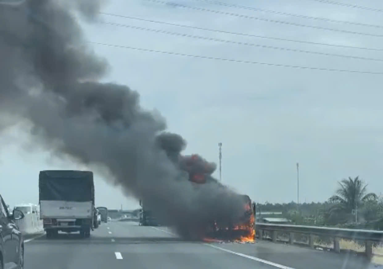 Khi chạy đến km24+ 700, tài xế phát hiện lửa bùng lên phía trước đầu xe, kèm khói bốc nghi ngút.