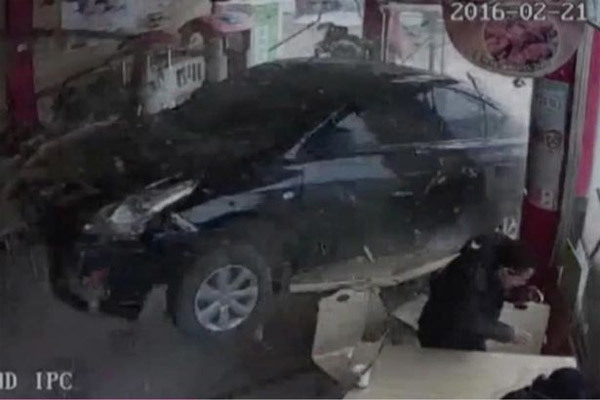 Một chiếc xe bất ngờ lao thẳng từ đường vào một cửa hàng bán đồ ăn nhanh, xuyên qua cửa kính rồi nhảy chồm lên và tông thẳng vào quầy lễ tân.