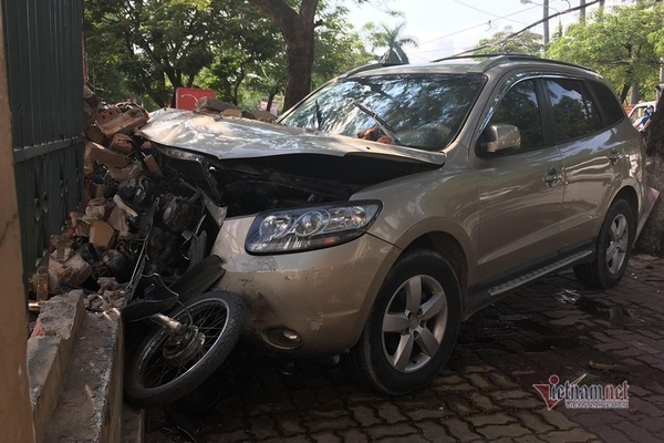 Tại hiện trường, phần đầu Santa Fe bị nát vụn, 2 xe máy hư hỏng, trong đó 1 chiếc bị kẹp giữa đầu ô tô và bức tường. 2 người bị thương được đưa đi cấp cứu.