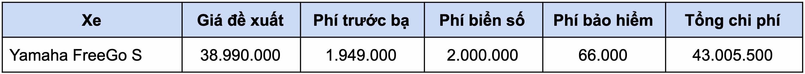 Giá lăn bánh Yamaha FreeGo S. Đơn vị: đồng. |