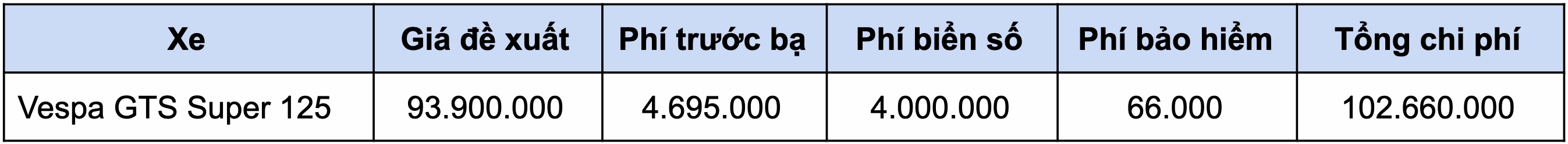 Giá lăn bánh Vespa GTS Super 125. Đơn vị: đồng. |