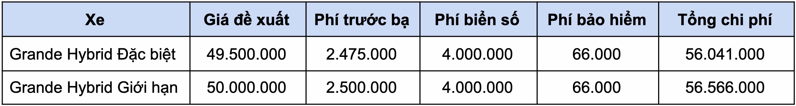 Grande Hybrid cũng đang được ưu đãi khoảng 2 triệu đồng. Do đó, mức giá lăn bánh thực tế của Grande Hybrid thấp hơn.