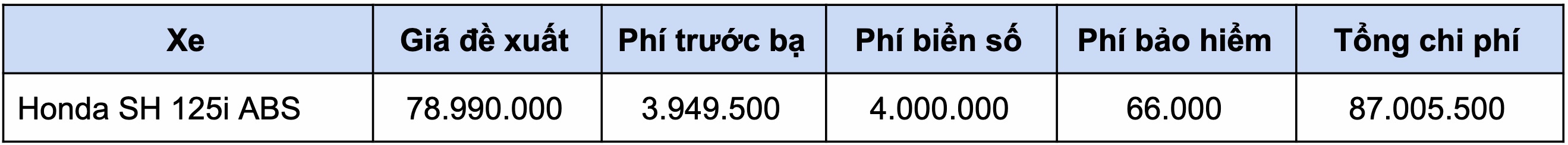 Giá lăn bánh Honda SH 125i ABS. Đơn vị: đồng. |