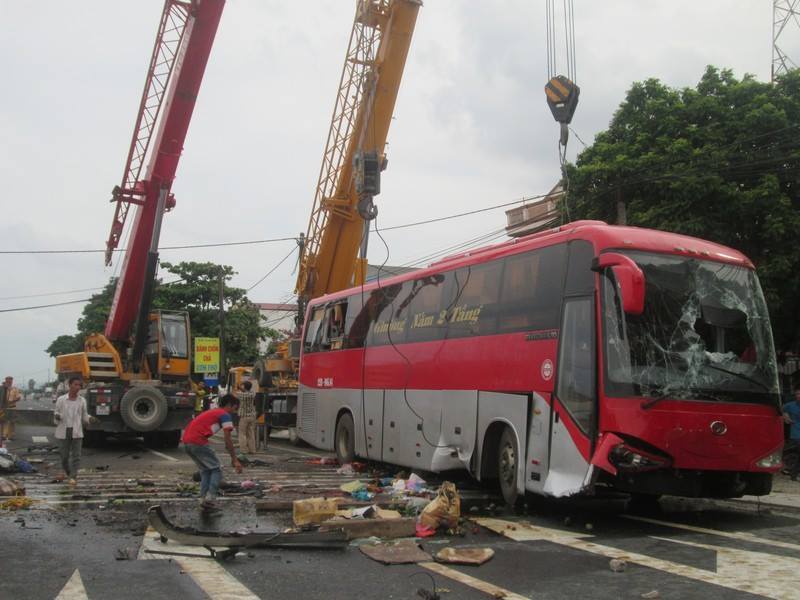 Ô tô khách giường nằm lao qua bên kia đường với tốc độ cao đã tông hàng loạt dải phân cách rồi đâm trực diện vào xe ben.
