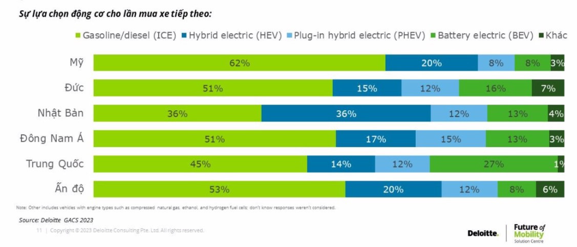 Theo nghiên cứu mới đây về nhu cầu mua ô tô của Deloitte - đơn vị chuyên nghiên cứu và đưa ra giải pháp toàn cầu cho thấy, nhu cầu "tậu" một chiếc xe cho lần mua tiếp theo của khách hàng tại các thị trường là khá khác biệt. Tuy nhiên, nhu cầu mua một chiếc sử công nghệ động cơ hybrid - HEV cao hơn hẳn so với các loại xe điện còn lại (bao gồm plug-in hybrid - PHEV, xe thuần điện - BEV và xe sử dụng năng lượng mới khác).