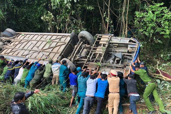 | Hiện trường xe khách lao xuống vực vỡ nát làm 6 người chết, 34 người bị thương |