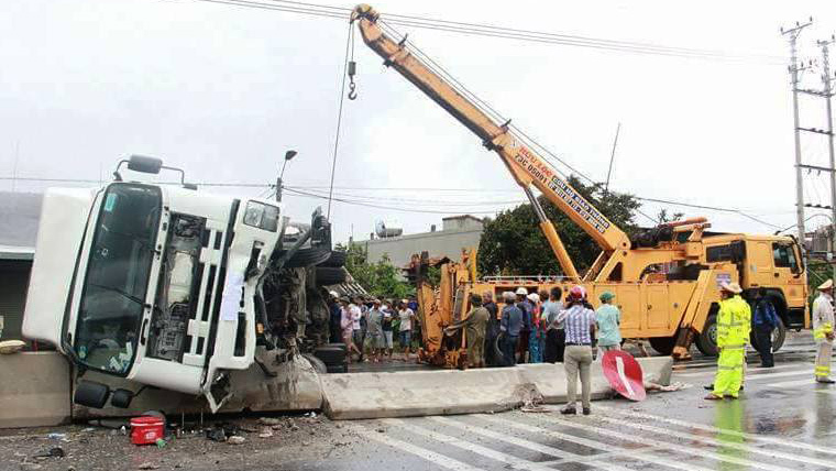 Tại hiện trường, chiếc xe tải nằm chắn ngang nửa đường, đầu gác lên dải phân cách, hư hỏng nặng.