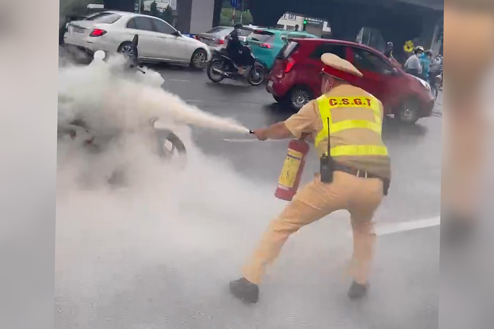 Đang trực chốt gần hiện trường, 2 cán bộ Đặng Văn Trường và Đào Minh Nghĩa thuộc Đội CSGT đường bộ số 6 đã nhanh chóng dùng bình chữa cháy mini dập tắt đám cháy.