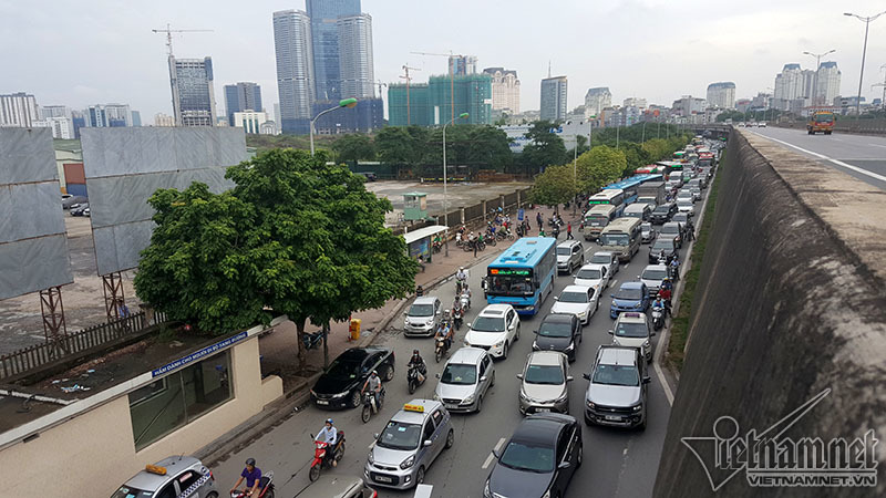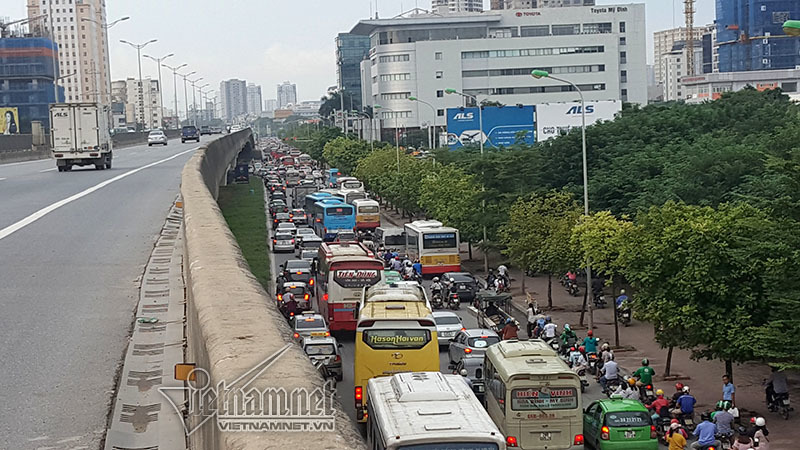 Đến 16h, đường trên cao hướng về bến xe Mỹ Đình bị cấm các phương tiện, tuyến đường Phạm Hùng bên dưới bị ùn tắc cục bộ.