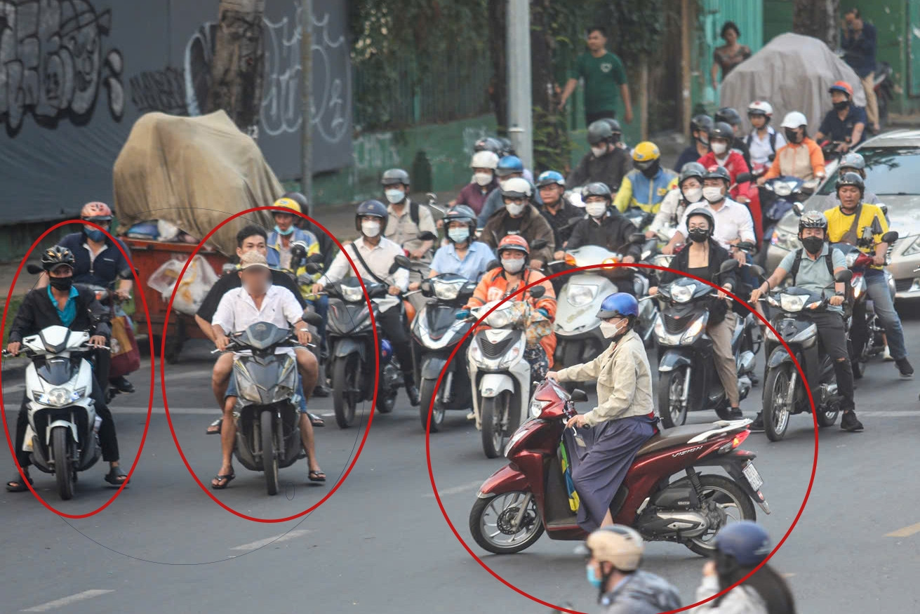 Nhiều người đi xe máy ở TPHCM vẫn vượt đèn đỏ, đi lên vỉa hè, dùng điện thoại, không đội mũ bảo hiểm, chở hàng cồng kềnh... tại các ngã tư và tuyến đường vắng bóng CSGT.