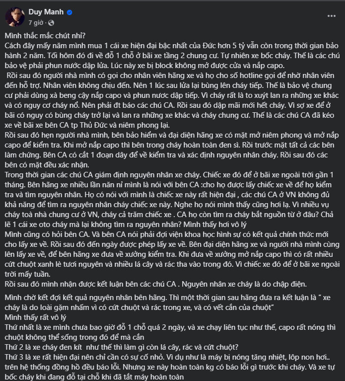 "Phía công an kết luận nguyên nhân cháy là do chập điện. Còn hãng xe thì cho rằng vụ cháy là do chuột cắn dây điện, dựa trên việc phát hiện phân chuột còn tươi và dấu vết gặm nhấm bên trong khoang máy", ca sĩ Duy Mạnh viết.