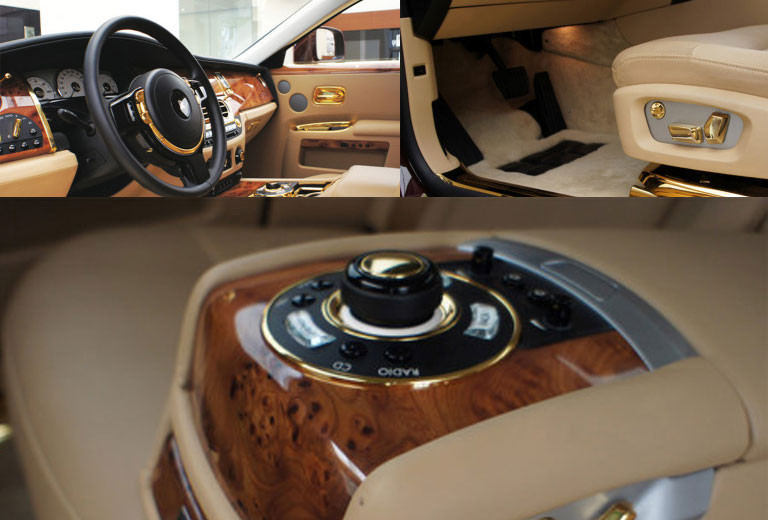 Ngoài đặc điểm bên ngoài mạ vàng ở các chi tiết như mâm bánh, viền cửa sổ, mặt ca-pô, ca-lăng phía trước, bên trong chiếc siêu sang Rolls-Royce Ghost BKS 30F-187.88 còn tiếp tục được trang trí bằng các chi tiết mạ vàng xuất hiện trên vô-lăng, bệ trung tâm, tay nắm hộp cốp trước, tay nắm cửa...