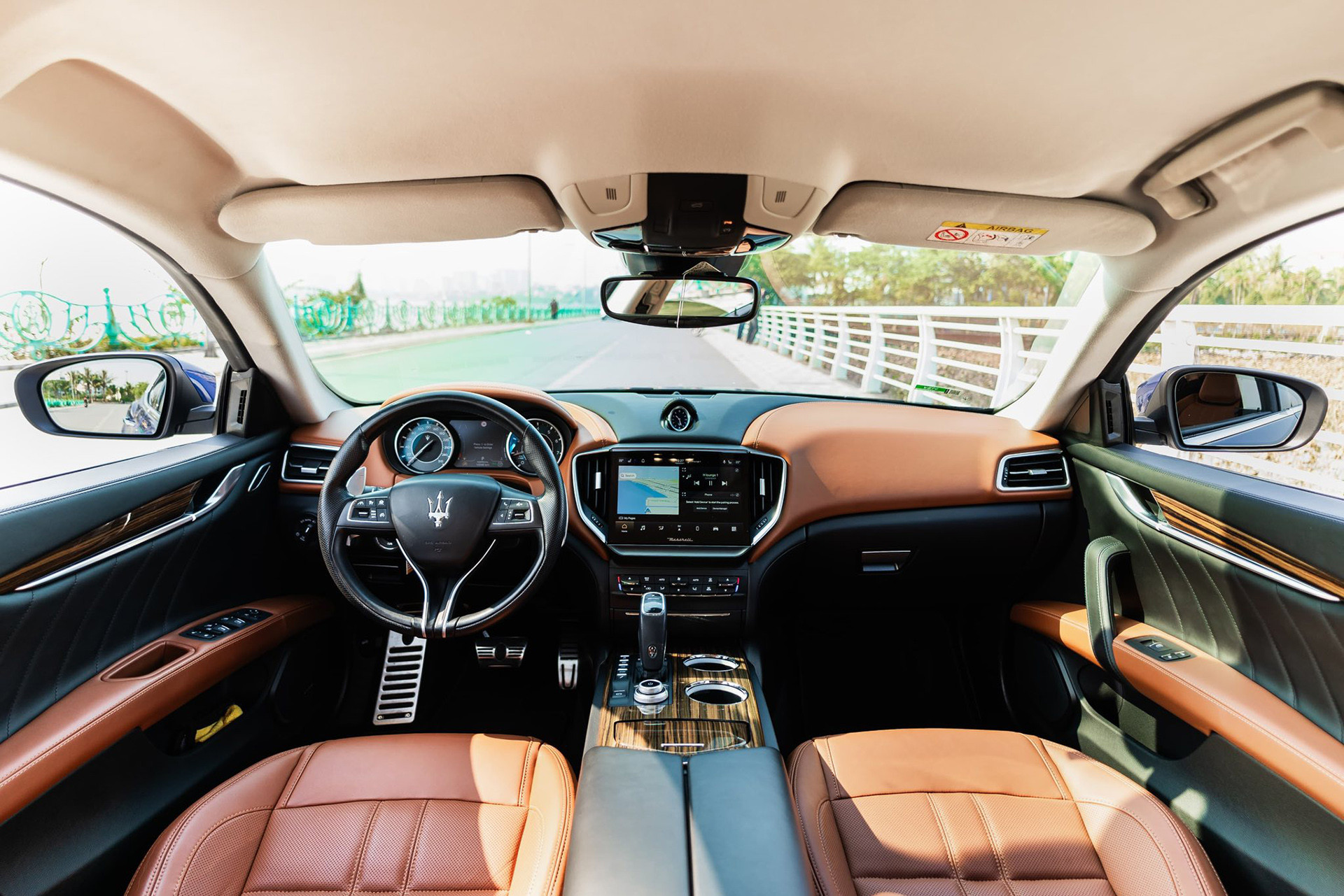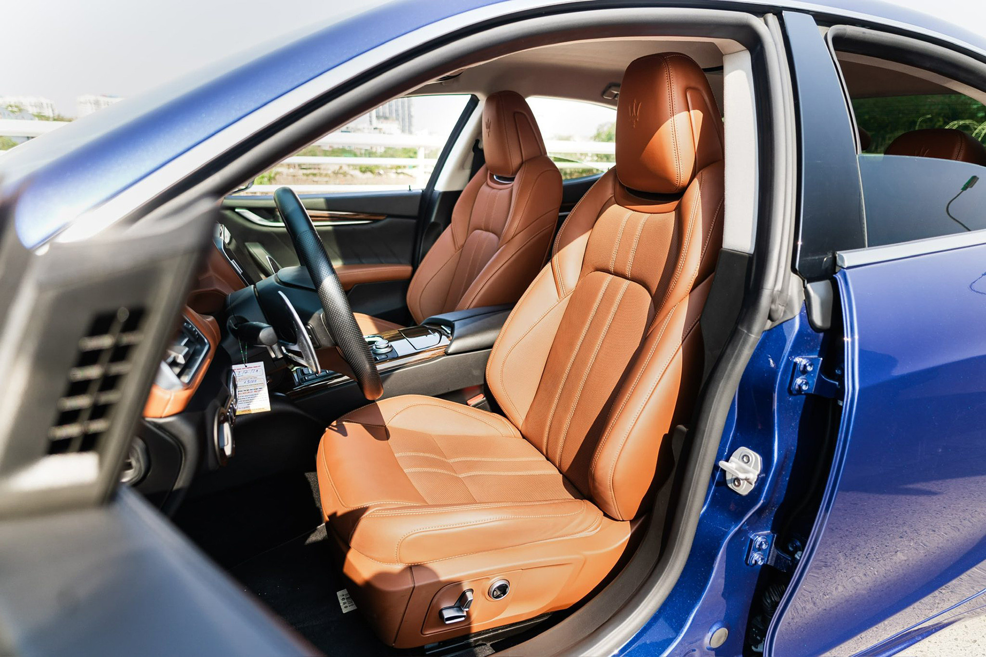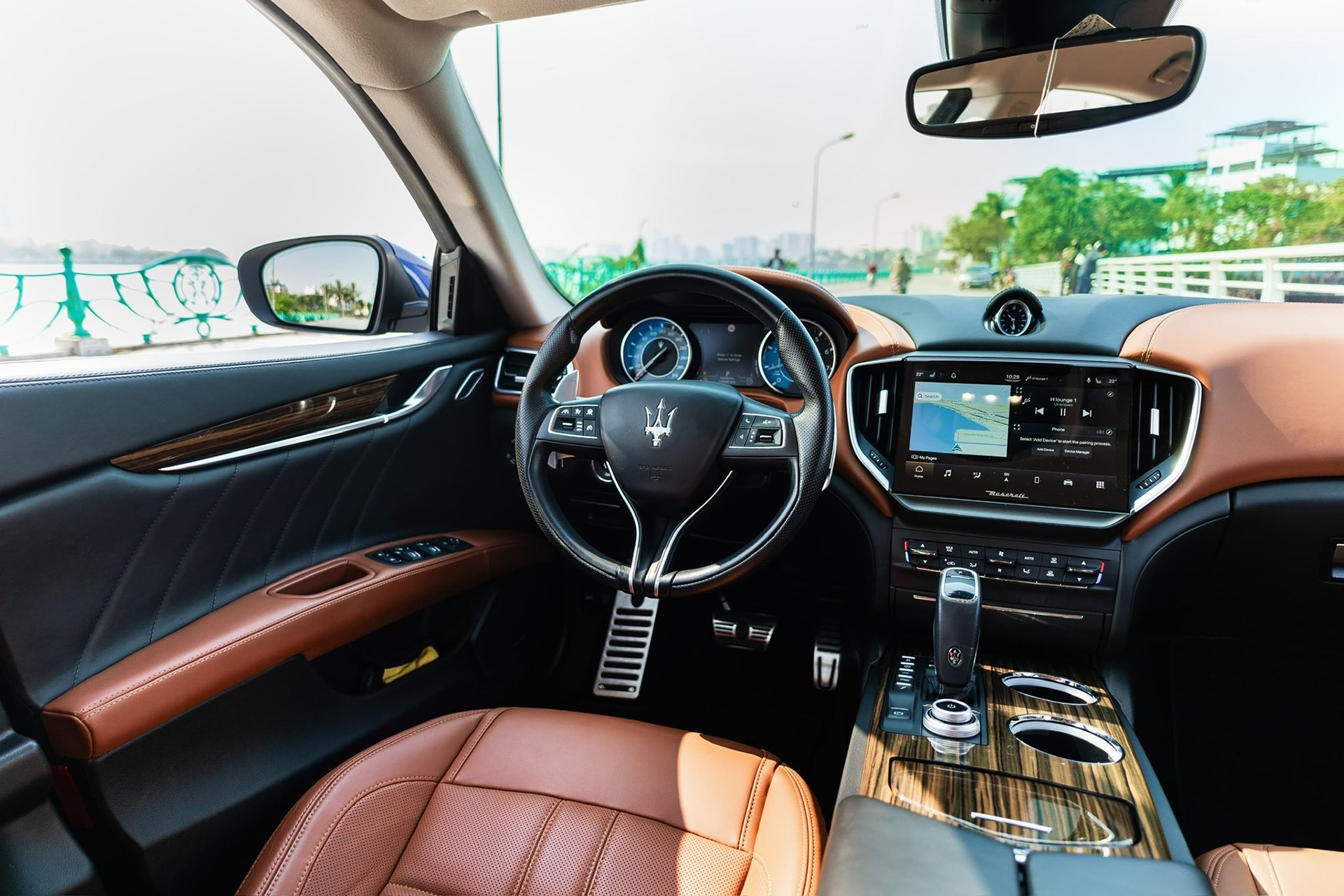 Nội thất chiếc Maserati Ghibli 2021 bọc da màu nâu chủ đạo. Với quãng đường lăn bánh chỉ vỏn vẹn khoảng 5.000 km/năm, ghế ngồi của xe chưa xuất hiện các vết nhăn và độ căng của da tương tự xe mới. Những chi tiết ốp gỗ trang trí thậm chí không có vết xước nhỏ.