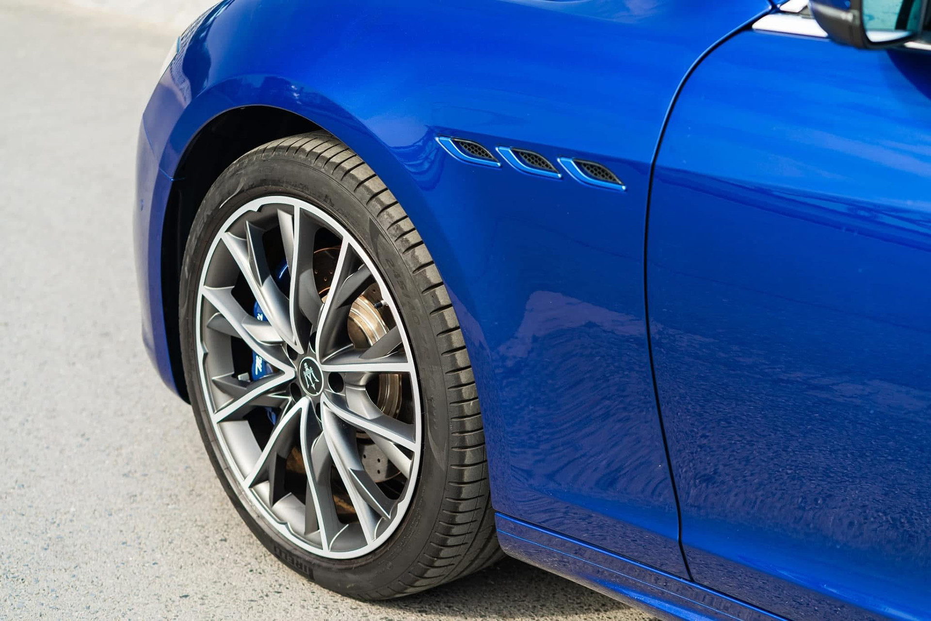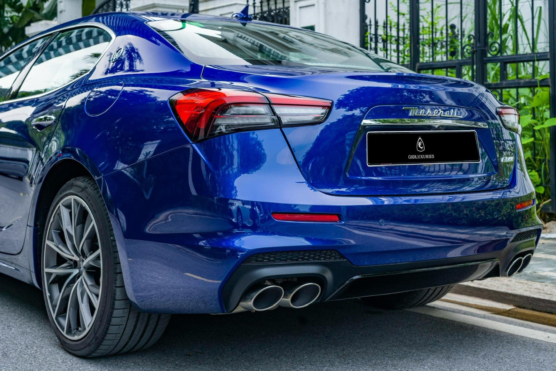 Chiếc Maserati Ghibli Hybrid này có ngoại thất sơn màu xanh dương với tên gọi Blu Emozione Metallic. Riêng tùy chọn này có giá không dưới 70 triệu đồng. Về cơ bản, do ít sử dụng và được chăm sóc cẩn thận, nước sơn xe còn khá mới. Một số chi tiết như mặt ca-lăng, ốp hốc gió, líp cản trước,… đều sơn đen nhằm tăng vẻ thể thao.
